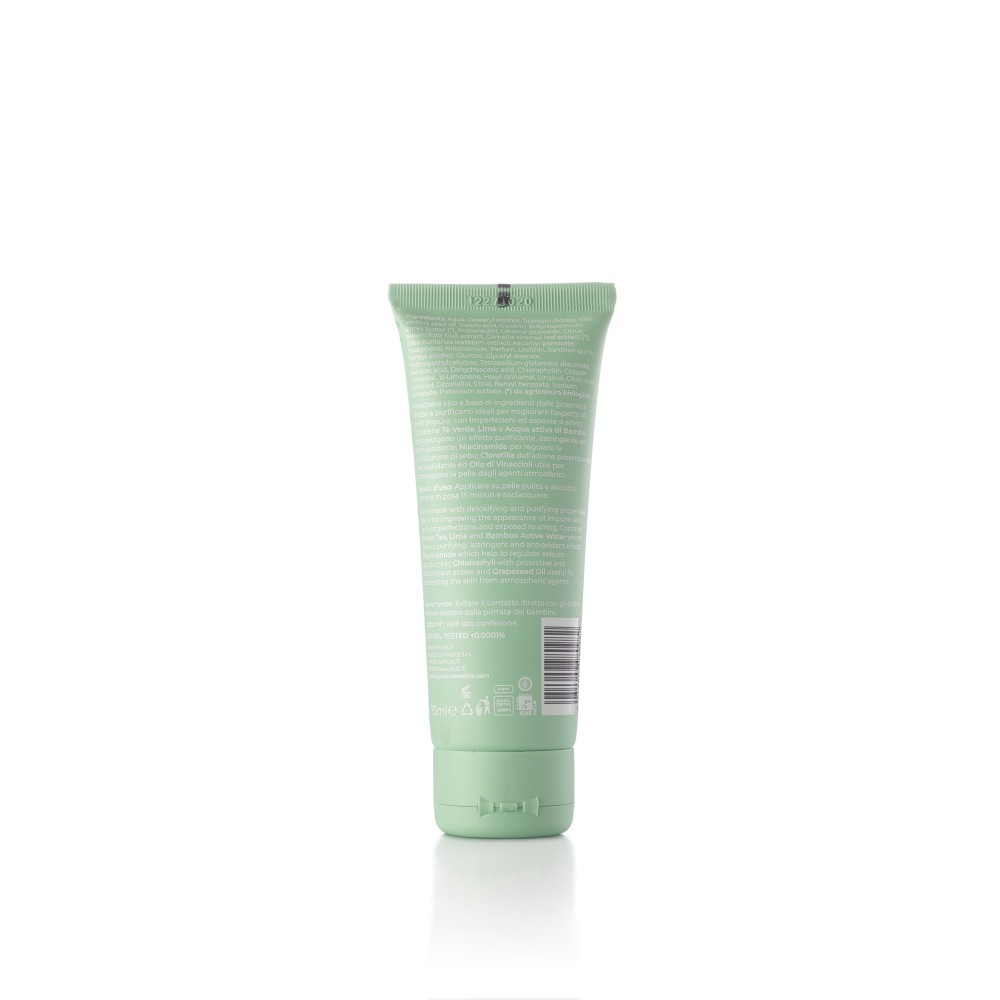 Maschera viso a base di ingredienti dalle proprietà detox e purificanti ideali per migliorare l’aspetto di pelli impure, con imperfezioni ed esposte a smog. Contiene Tè Verde, Lime e Acqua attiva di Bambù che svolgono un effetto purificante, astringente ed antiossidante; Niacinamide per regolare la produzione di sebo; Clorofilla dall’azione protettiva ed antiossidante ed Olio di Vinaccioli utile per proteggere la pelle dagli agenti atmosferici.