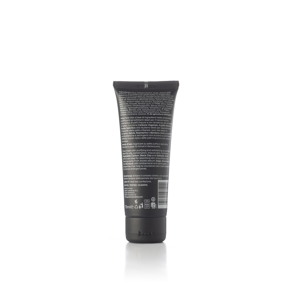 Maschera viso a base di ingredienti dalle proprietà purificanti ed esfolianti ideali per il trattamento cosmetico di pelli impure e con tendenza ad eccesso di sebo. Contiene Carbone Vegetale, Argilla Nera e Acido Salicilico che risultano ideali per assorbire le impurità della pelle e liberare i pori dal sebo in eccesso; Salvia, Rosmarino e Bardana dalle proprietà antibatteriche e astringenti che aiutano a contrastare l’effetto lucido tipico delle pelli impure e con sebo in eccesso.