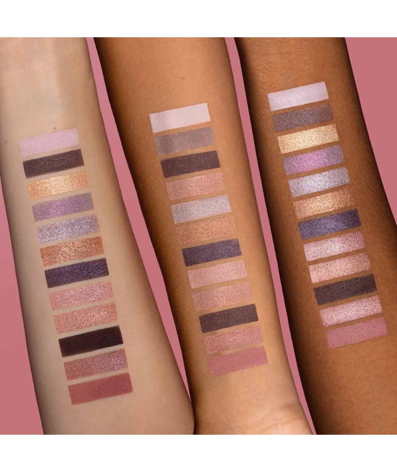 Rosa gesso freddo opaco. Particolare e trasformista: applicato sopra le tonalità shimmer della palette ne modifica il finish rendendole matte.